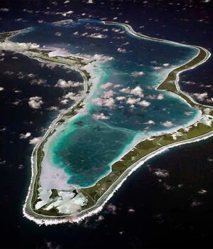 Esta imagem divulgada pela Marinha dos EUA mostra uma vista aérea de Diego Garcia no arquipélago de Chagos.