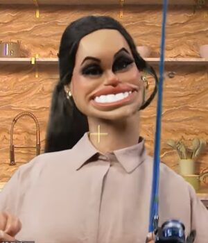 Torcendo uma linha de Tubarão, ‘Precisamos de um barco maior’, a boneca Meghan – com uma vara de pescar – diz: ‘Precisamos de uma casa maior.’