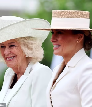 A Rainha Camilla (à esquerda) sorri sob seu chapéu de abas largas enquanto se senta ao lado da primeira-dama Melania Trump (centro à esquerda) para uma cerimônia de boas-vindas com o rei Charles (à direita) no gramado sul da Casa Branca na manhã de terça-feira