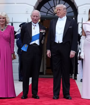 Antes do discurso, o presidente Trump e a primeira-dama Melania estenderam o tapete vermelho para o rei Charles e a rainha Camilla.