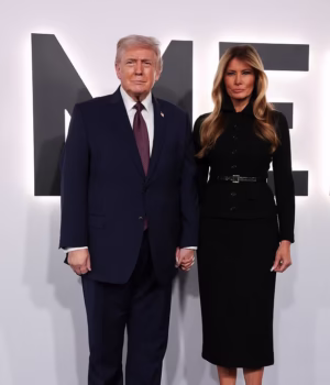 Melania Trump chegou com estilo ao lado do marido, com uma elegante jaqueta e saia de botão, na estreia de seu novo filme, Melania, no Kennedy Center na noite de quinta-feira.