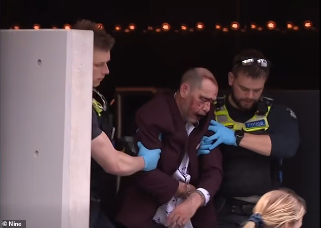 Na imagem, o suspeito está coberto de sangue no sangue que está sob as algemas da ambulância e antes de transferir o Royal Melbourne para o hospital Royal Melbourne com ferimentos graves, onde está sob avaliação.