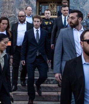CEO e presidente da Meta, Mark Zuckerberg (centro), após testemunhar no histórico julgamento de dependência de mídia social no Tribunal Superior de Los Angeles em 18 de fevereiro de 2026.