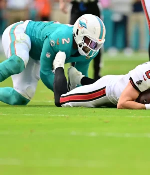 MIAMI GARDENS, FLÓRIDA – 28 DE DEZEMBRO: Bradley Chubb nº 2 do Miami Dolphins demite Baker Mayfield nº 6 do Tampa Bay Buccaneers durante o primeiro quarto no Hard Rock Stadium em 28 de dezembro de 2025 em Miami Gardens, Flórida. (Foto de Julio Aguilar/Getty Images)