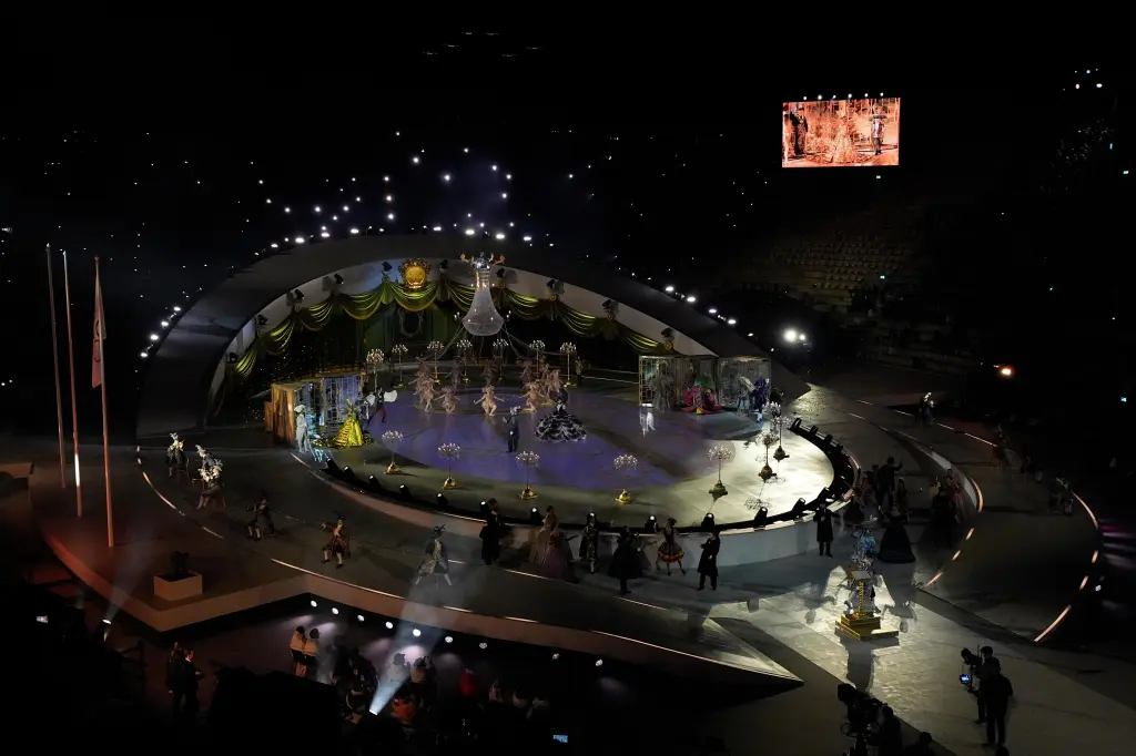 O show de duas horas e meia começou com uma extravagante homenagem à ópera lírica italiana, com o diretor de palco torcendo não apenas pelo elenco do ato de encerramento, incluindo o cantor italiano Achille Lauro, mas também pelos personagens da ópera há muito adormecidos, presos em caixotes nos túneis do anfiteatro.