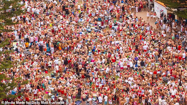 Uma das praias mais famosas da Austrália foi pintada de vermelho festivo enquanto milhares de foliões se reuniam na praia para celebrar o feriado vestidos com roupas com tema natalino.