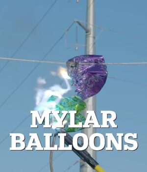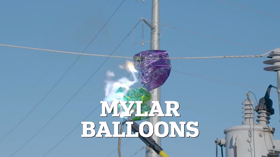 Os balões Mylar possuem um revestimento metálico altamente inflamável e condutor de eletricidade. Quando colidem com linhas de energia, podem causar incêndios, conforme mostrado na foto acima.