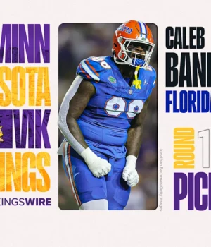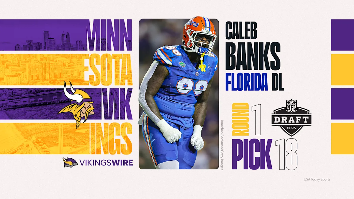 Com a 18ª escolha no draft, The Minnesota Vikings Caleb Banks selecionado, tackle defensivo da Flórida. Banks é um homem monstruoso, que se encaixará perfeitamente nesta linha defensiva, já que precisa substituir Javon Hargrave e Jonathan Allen. Banks, ex-Gator, vem lutando contra uma lesão no pé nesta temporada.