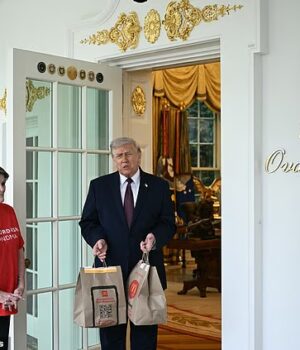 Do lado de fora do Salão Oval, o presidente recebeu duas sacolas marrons cheias de McDonald’s de um entregador do DoorDash. Não está claro se o evento foi encenado ou se o motorista foi treinado sobre o que dizer.