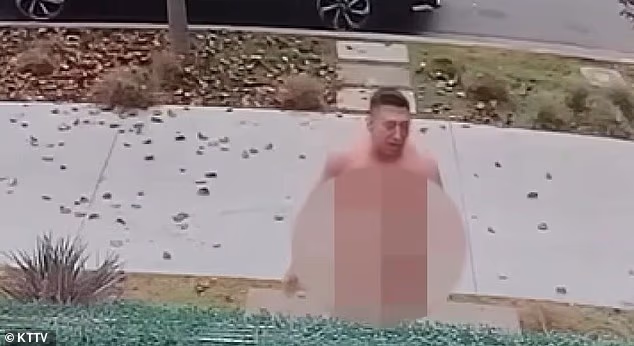 Momentos antes do confronto fatal, imagens de vigilância capturaram o intruso nu cambaleando pela rua, gritando e tentando abrir a porta do carro antes de se aproximar da propriedade.