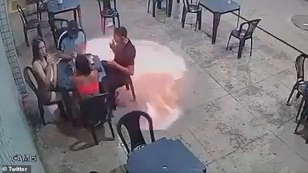 As imagens capturaram o momento dramático em que uma enorme chama surgiu no ar atrás do homem Ele deixou cair o fósforo que havia usado, fazendo com que ele e seus amigos corressem para salvar suas vidas e a apenas alguns metros de distância de um caminhoneiro que estava abastecendo seu táxi com diesel.