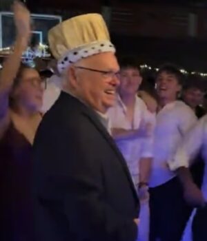 O ousado acadêmico entrou no baile com um enorme sorriso no rosto enquanto os alunos o aplaudiam e o aclamavam como ‘nosso rei’ enquanto a música ‘Hero’ do Nickleback tocava ao fundo, um Agora clipe viral mostrou
