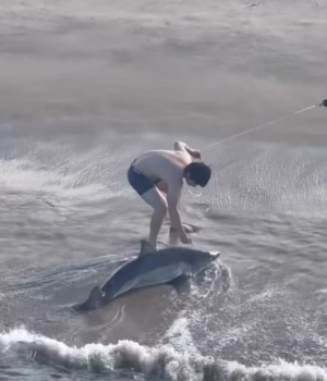 Lutando contra ondas e tubarões de dentes afiados, ele consegue libertar a linha de pesca com as próprias mãos antes de ajudar a criatura a recuperar o equilíbrio e nadar em segurança para o mar.