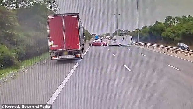 Imagens da Dashcam, tiradas pelo motorista de caminhão Lee Flower, mostram um caminhão viajando pela M5 – perto de Evesham, Worcestershire – quando um carro vermelho rebocando uma caravana entra em alta velocidade na rodovia.