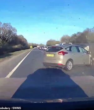 O Ford então desviou para a faixa interna da estrada A e por pouco errou o carro que a filmagem gravou.