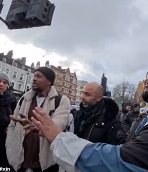 Este é o momento em que um homem muçulmano (à direita) grita “Não queremos adorar um homem judeu” a um pregador de rua cristão (à esquerda) em Whitechapel.