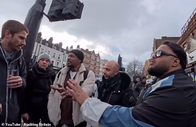 Numa cena barulhenta e caótica, um homem usando uma máscara cirúrgica preta pode ser visto respondendo ao policial: “Aqui é Whitechapel, esta é uma área muçulmana”.