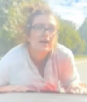Uma mulher (acima) pula no capô do carro de Natalie Alice Shaw em julho de 2025