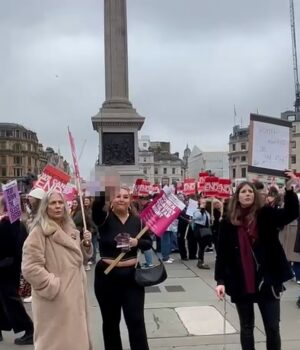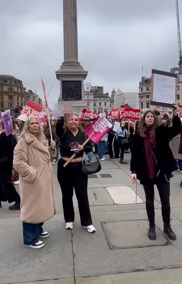 Imagens chocantes dos protestos de hoje no centro de Londres mostram uma mulher em Trafalgar Square gritando “Fodam-se” aos manifestantes iranianos anti-regime e mostrando o dedo médio enquanto segura uma placa que diz “Mulheres Contra a Extrema Direita”.