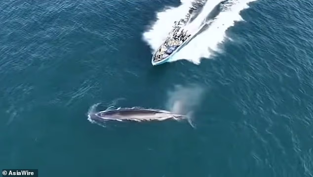 Imagens de drones capturadas por turistas mostraram as baleias de Bryde emergindo para respirar, e barcos de observação de baleias permaneciam nas proximidades, descansando ou mantendo distância, espirrando água algumas vezes.
