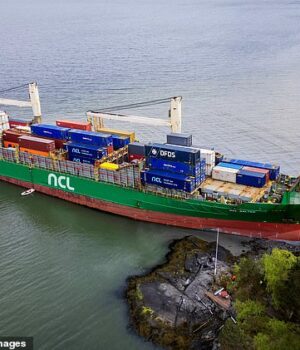 Um proprietário norueguês acordou para descobrir uma distribuição inesperada deixada pela porta da frente – um navio de contêineres de 135 metros que levantou o feroz e sua residência costeira perdida pela menor margem.