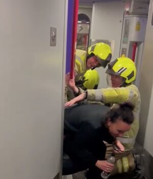 Um passageiro claustrofóbico a caminho de um evento de fitness da Hyrox teve que ser retirado do banheiro de um trem pelos bombeiros depois de ficar preso por quase duas horas.