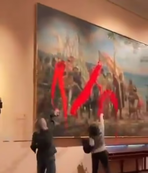 Quando a tinta foi jogada na obra de arte, uma pequena multidão gritou em sua direção, o que representava Colombo desembarcando no Novo Mundo em 1492.