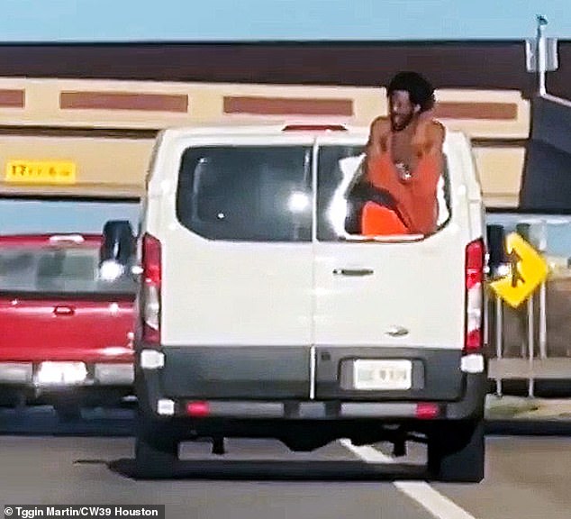 Os motoristas ficaram chocados com uma extremidade movimentada do interro 40, quando um cativo sem camisa, algemado, pegou a janela quebrada de uma van de prisão estadual.