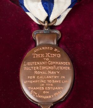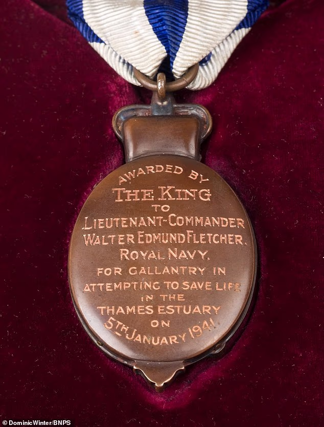 A tentativa corajosa do tenente -comandante Fletcher de salvá -lo, matriculada em sua medalha de Albert, escreve: ‘Em 5 de janeiro, o tenente comandante Fletcher levou seu navio para resgatar a senhorita Amy Johnson, que estava operando um avião no mar.