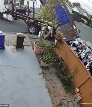 Quando a empresa de Perez chegou para recolher a lixeira, descobriu que ela estava cheia e, em vez disso, despejou seu conteúdo de volta na garagem, o que foi capturado por câmeras circulares.