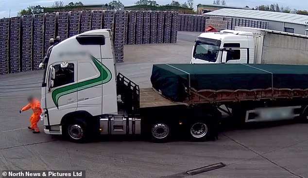 Imagens chocantes mostram o gerente, vestido com roupas de trabalho laranja fluorescente, aproximando-se da cabine do caminhão, antes que Lay feche a porta.