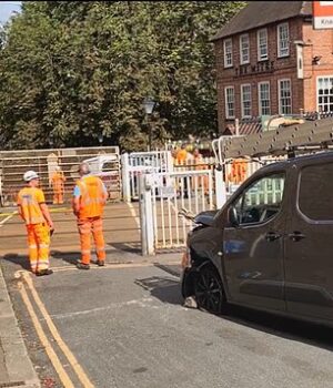 Motorista de van que tentou culpar seu cachorro pelo acidente admitiu dirigir sem os devidos cuidados e atenção (Imagem: Carro após colisão com barreira de passagem de nível)