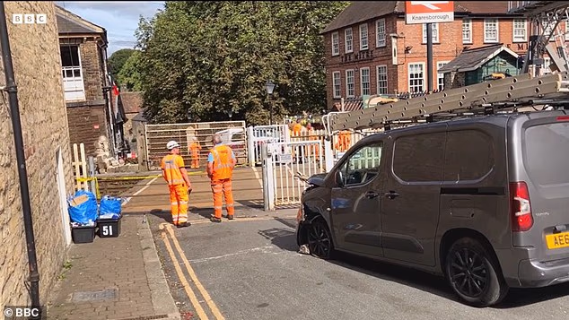 Jodie Lovatt, 49, estava tentando dar partida em seu carro e dar ré quando ele de repente capotou e bateu em uma barreira de passagem de nível e bateu em um prédio na estação de Knaresborough, em North Yorkshire, em julho do ano passado.