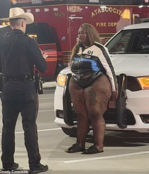 A motorista não identificada usava uma jaqueta de corrida de couro justa e micro shorts combinando com meias arrastão no momento de sua prisão.