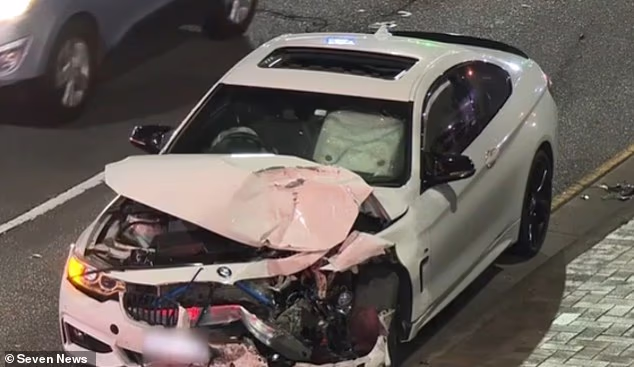 Um BMW branco dirigido por um motorista de placa P de 19 anos é fotografado após o acidente