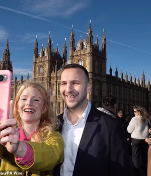 Hannah Spencer e o líder dos Verdes, Jack Polanski, posam para uma selfie fora do Parlamento