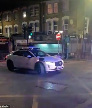 Neste ponto, um veículo Waymo entrou diretamente na fita da cena do crime, evitando por pouco um carro da polícia antes de parar.