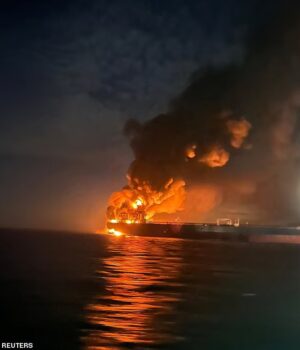 A Direção-Geral de Assuntos Marítimos da Turquia disse que o primeiro navio-tanque, o Kairos, de bandeira gambiana, pegou fogo a cerca de 45 quilômetros da costa da província de Kocaeli, no país.