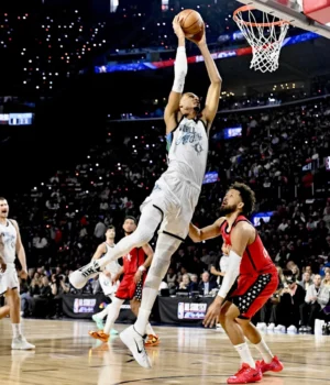 Edwards enfrentou Wembanyama na dica inicial, sugerindo que o Team Stars não levou o jogo a sério (afinal, “tenho 1,80 metro”, disse Edwards, que tem 6-4, “e ele tem 2,50 metros”). Só que Wembaniama contou a Jamal Murray, imediatamente postou Cade Cunningham e deu uma enterrada tão estrondosa que mudou o tom da noite.