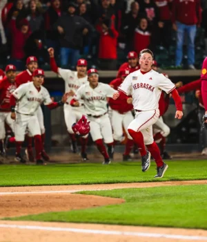 Isso preparou o cenário para uma caminhada de Stokes, um golpe de Moyer e um arremesso selvagem de Matson, que deixou o banco de reservas de Nebraska vazio para perseguir Stokes e Moyer para comemorar no campo central. Jogo de bola!