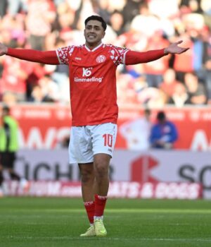 Nadeem Amiri rebateu o árbitro após a derrota do Mainz para o Bayer Leverkusen.