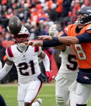 O passe perdido do quarterback do Denver Broncos, Jarrett Stidham, foi uma jogada fundamental na derrota de seu time para os Patriots. (Foto de Barry Chinn/The Boston Globe via Getty Images)