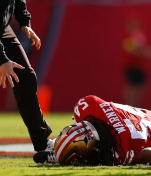 49 pessoas sentirão falta do linebaker Fred Warner, que sofreu uma lesão no tornozelo no final da temporada. (Foto de Mike Ehman/Getty Fig.)