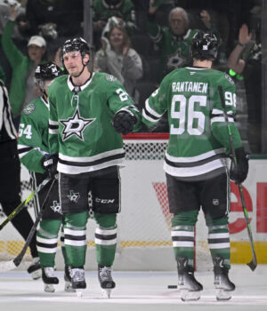 Dallas Stars Center Rup Hintz (24) e direita Mikko Rentanne (96) comemora uma meta líquida vazia marcada por Hintz
