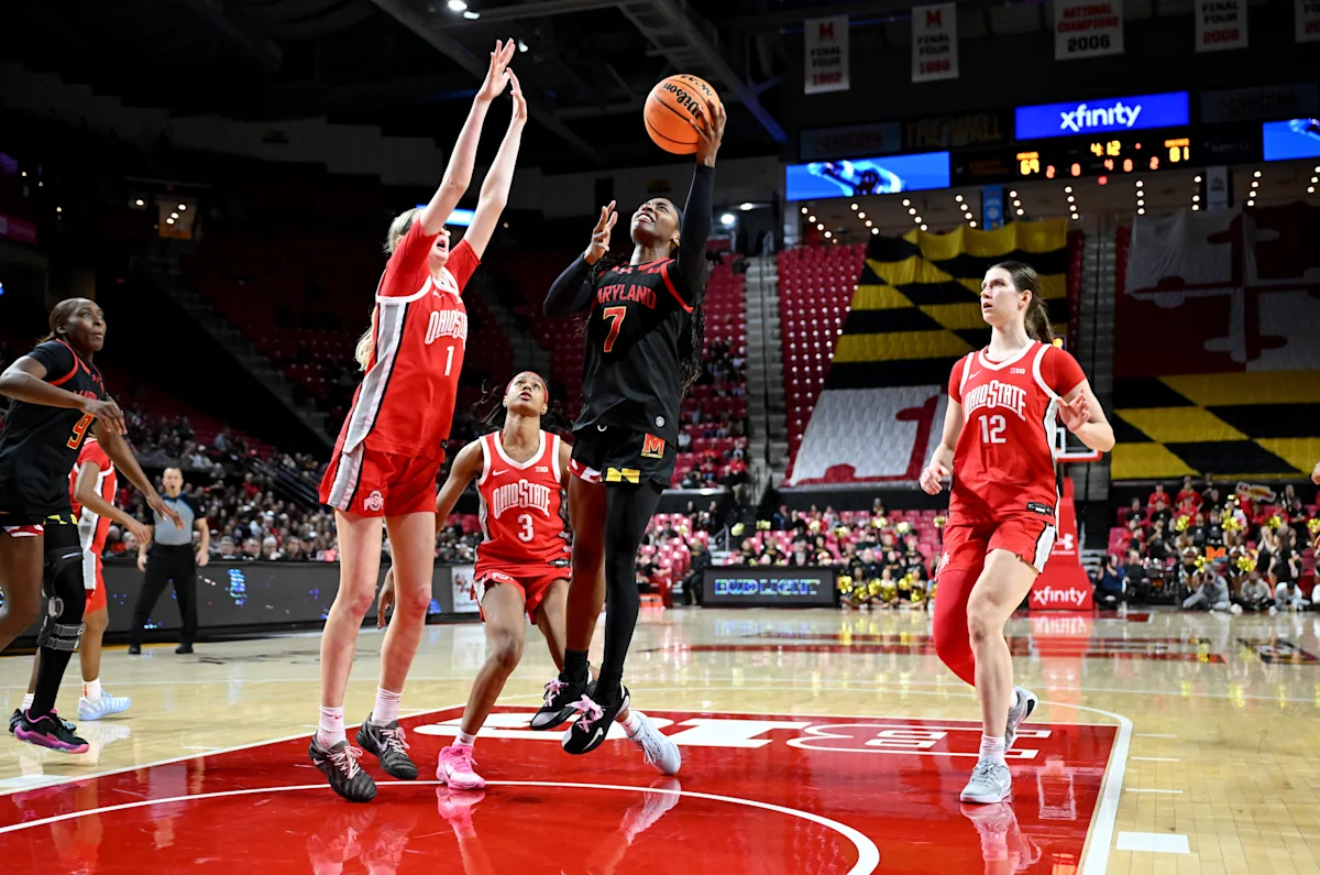 O Terps teve um bom desempenho, construindo uma vantagem de 12 pontos nos primeiros 10 minutos. No entanto, os jogos entre Terps e Buckeyes sempre apresentaram oscilações de impulso, e uma delas ocorreu no início do segundo quarto.