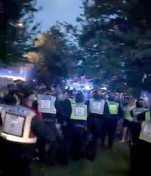 Nas filmagens surpresa publicadas on -line, as multidões entraram em conflito com funcionários em Hampshire havant durante a noite, porque a polícia armada com tumultos protege o jovem de 38 anos -ano em custódia