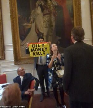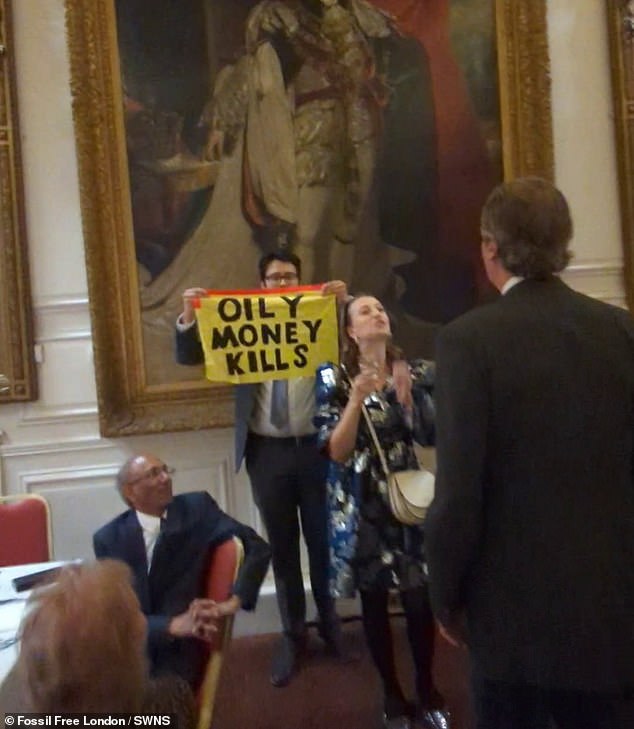 Enquanto Trump desembarcou no Reino Unido, os manifestantes climáticos visitaram um estado de vendas republicano no Reino Unido na noite passada na Windsor Guildha.