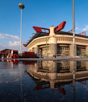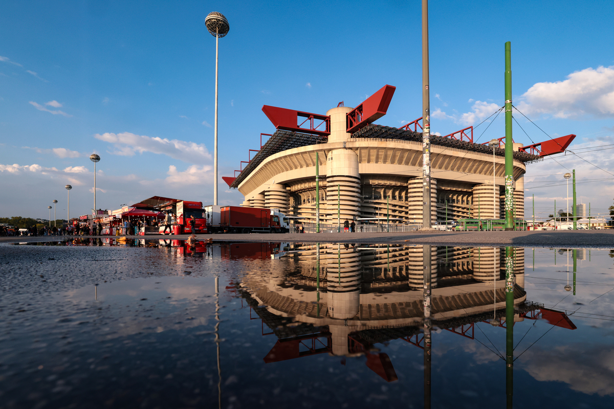 Milão, Itália – 28 de setembro: Uma cena simples do estádio foi refletida na água da chuva antes da rodada Italia Fresherosa AC Milan e US Lesses entre o Estádio Jewisheppe Maya em 23 de setembro de 2021 na Itália. (Foto Jonathan Moscrop/Getty Fig.)