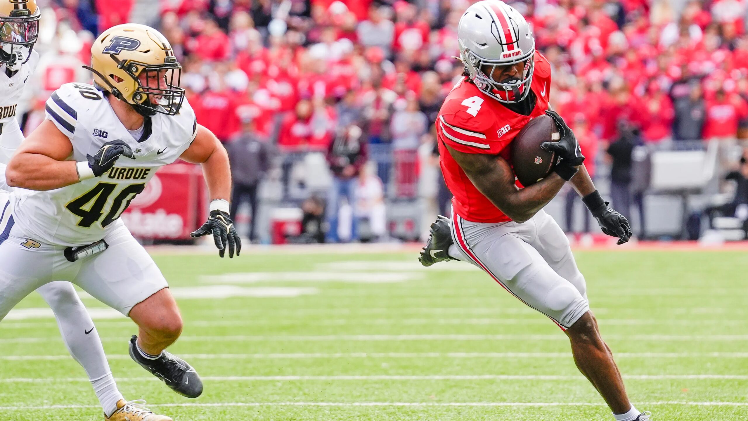 O wide receiver do Ohio State Buckeyes, Jeremiah Smith (4), corre a bola contra o linebacker do Purdue Boilermakers, Hudson Miller (40), durante o primeiro tempo no Ohio Stadium no sábado, 9 de novembro de 2024, em Columbus, Ohio.