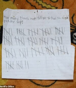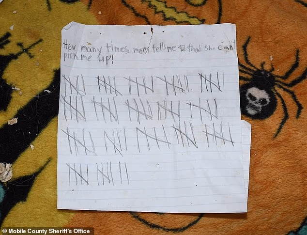 Os investigadores também encontraram uma carta comovente escrita a lápis da menina, intitulada: ‘Quantas vezes a mãe me diz que não pode me criar!’ Mais de 80 marcas de registro preenchem a página